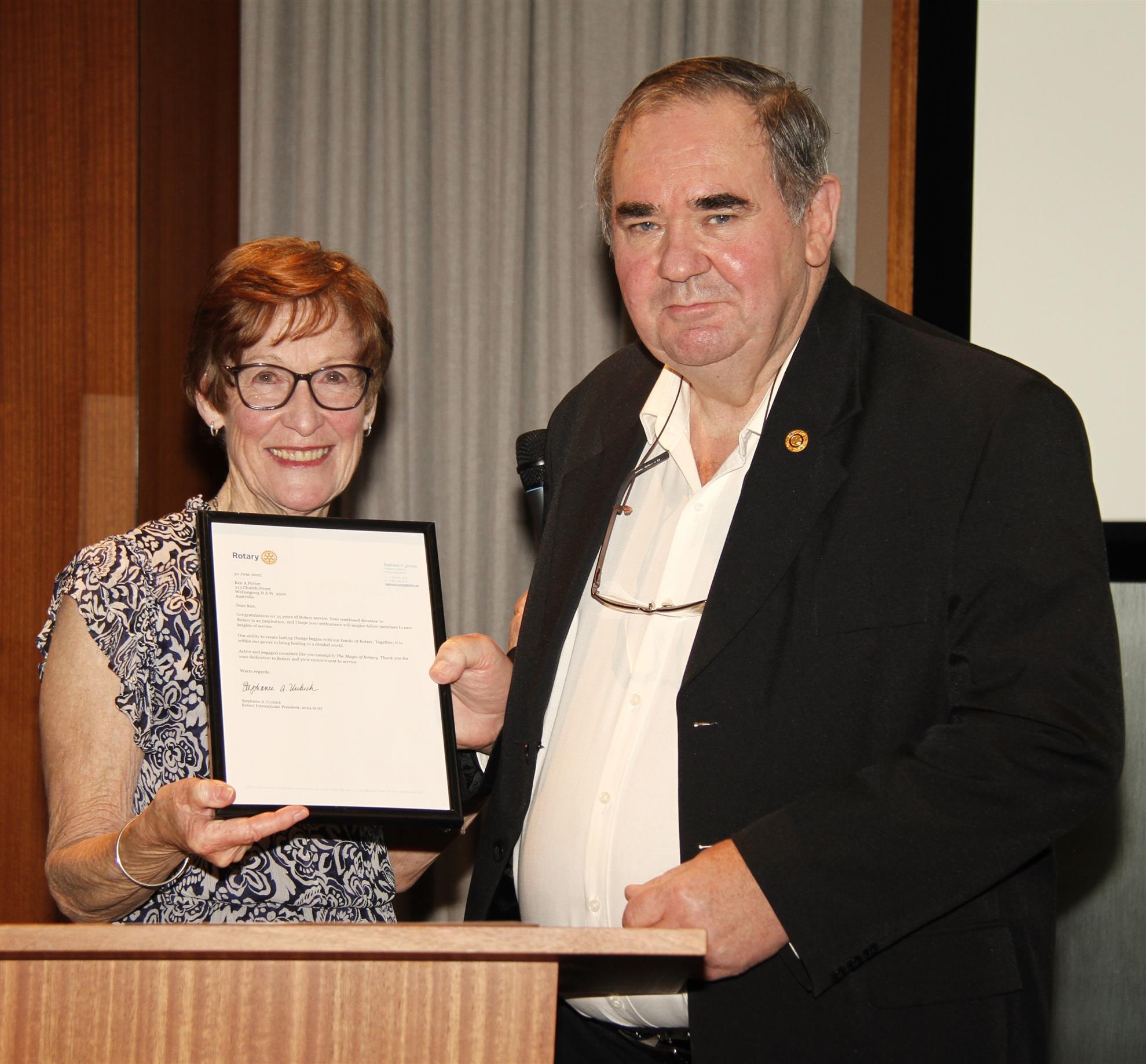 PP Ken Potter was also recognised for his 25 years in Rotary, 20 of which has been spent as a very active Board member. Ken too devotes an enormous amount of time to Rotary and to our club events as evidenced by his well- deserved receipt last October of a PHF++. Ken is also a well-loved, hard- working and appreciated member of our club.