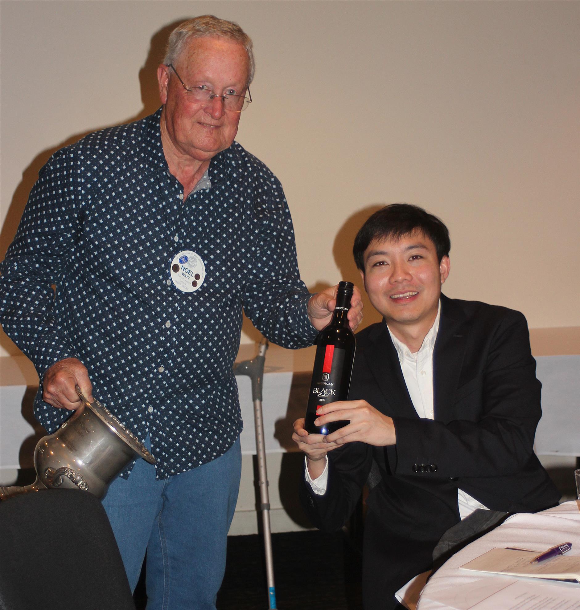 Our wine raffle winners were Kate Thomas and Ken Potter, who graciously donated his bottle of red to our guest, Thanapon Deekaikam.